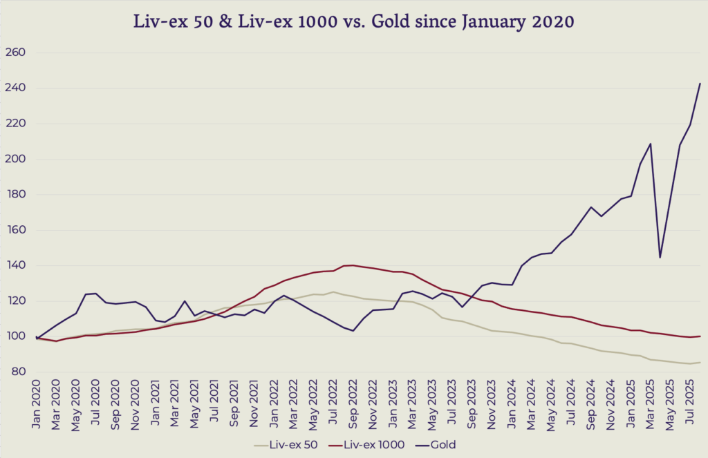 Gold has surged since 2022 (see figure below), driven by inflation and global tensions. Fine wine, meanwhile, has lagged, correcting after its pandemic-era boom. But signs of a turnaround are emerging: the Liv-ex 50 (Bordeaux First Growths Index) posted its first monthly gain in September after nearly three years of declines. Historically, fine wine reacts to macroeconomic shifts with a 6–12 month delay compared to regulated assets. So, while we don’t expect an overnight rebound, the trajectory afoot is worth watching for further developments.
