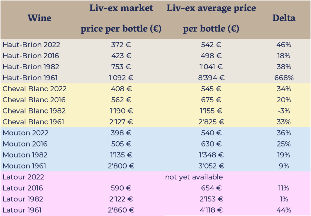 A: For wines with low liquidity (i.e. infrequent trades), these numbers become less meaningful in isolation. However, the spread between Market and Average prices can offer insights: