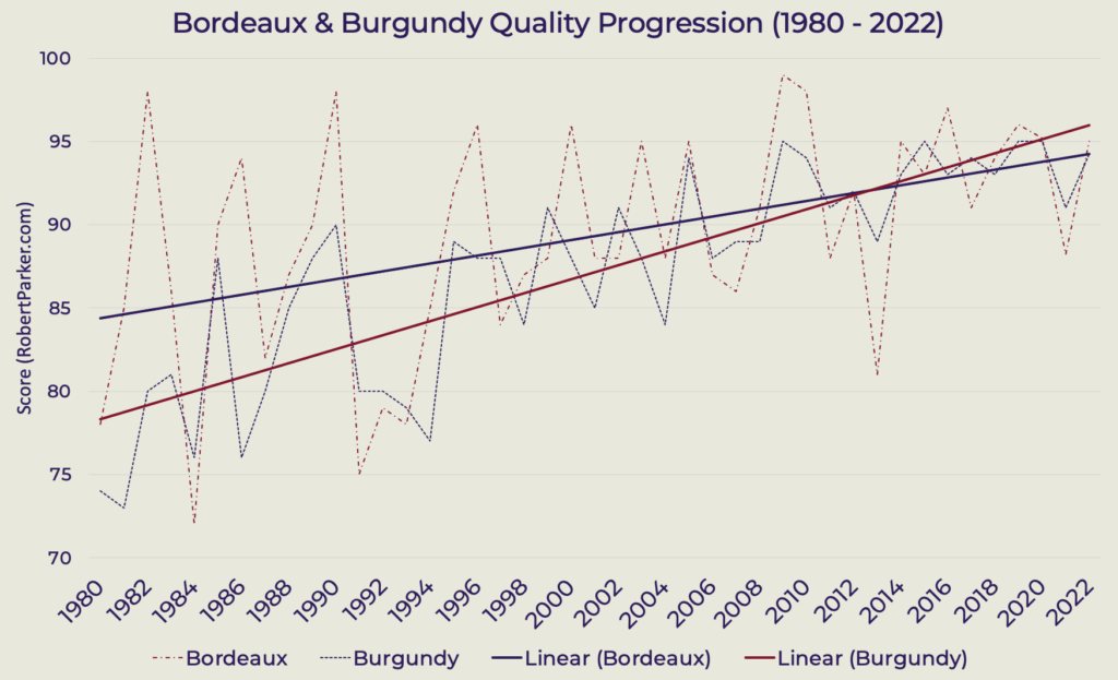Between 1980 and 2000, famous wine critic Parker’s average critic score stood at 87 for Bordeaux and 83 for Burgundy. From 2001 to 2022, both regions averaged 92, which is a remarkable leap and reflects the evolution of winemaking practices and climate conditions alike (see figure below).